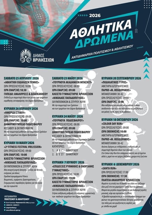 Ο Δήμος Βριλησσίων ανακοινώνει το ετήσιο πρόγραμμα αθλητικών δράσεων «Αθλητικά Δρώμενα 2026», μια σειρά εκδηλώσεων που προάγουν τη φυσική άσκηση, την ευεξία και τη συμμετοχή πολιτών όλων των ηλικιών.