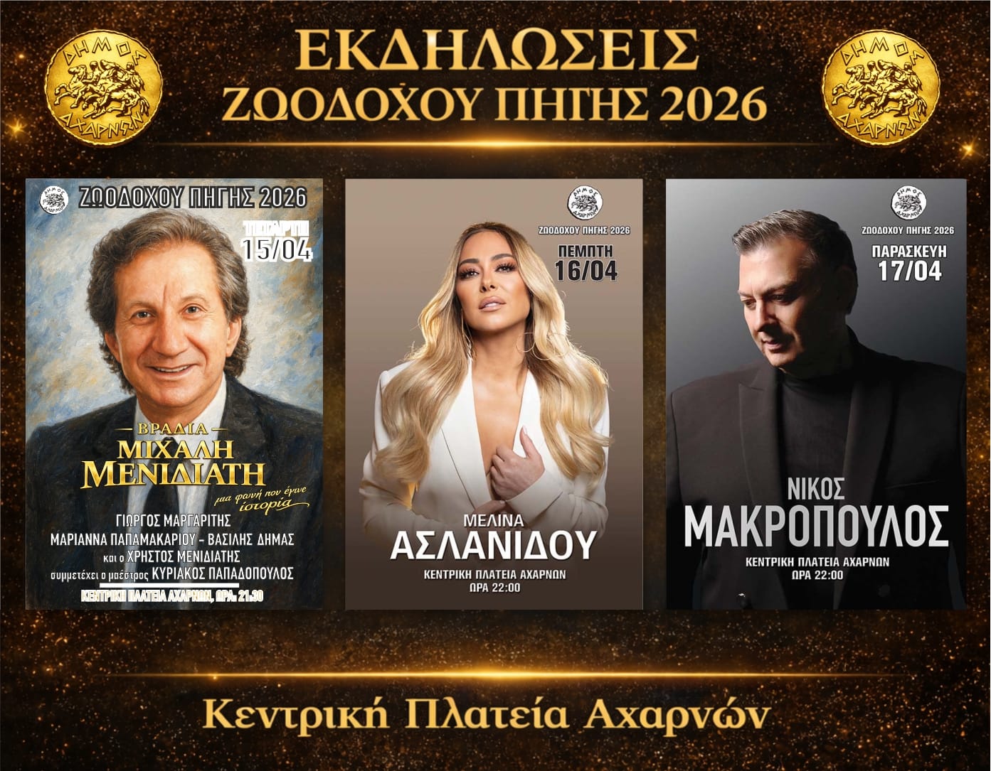 Ο Δήμος Αχαρνών, τιμώντας όπως κάθε χρόνο την εορτή της Ζωοδόχου Πηγής έχει ετοιμάσει μια σειρά εκδηλώσεων. Ξεχωριστό κομμάτι αποτελούν οι συναυλίες που και φέτος θα πραγματοποιηθούν στην Κεντρική Πλατεία.