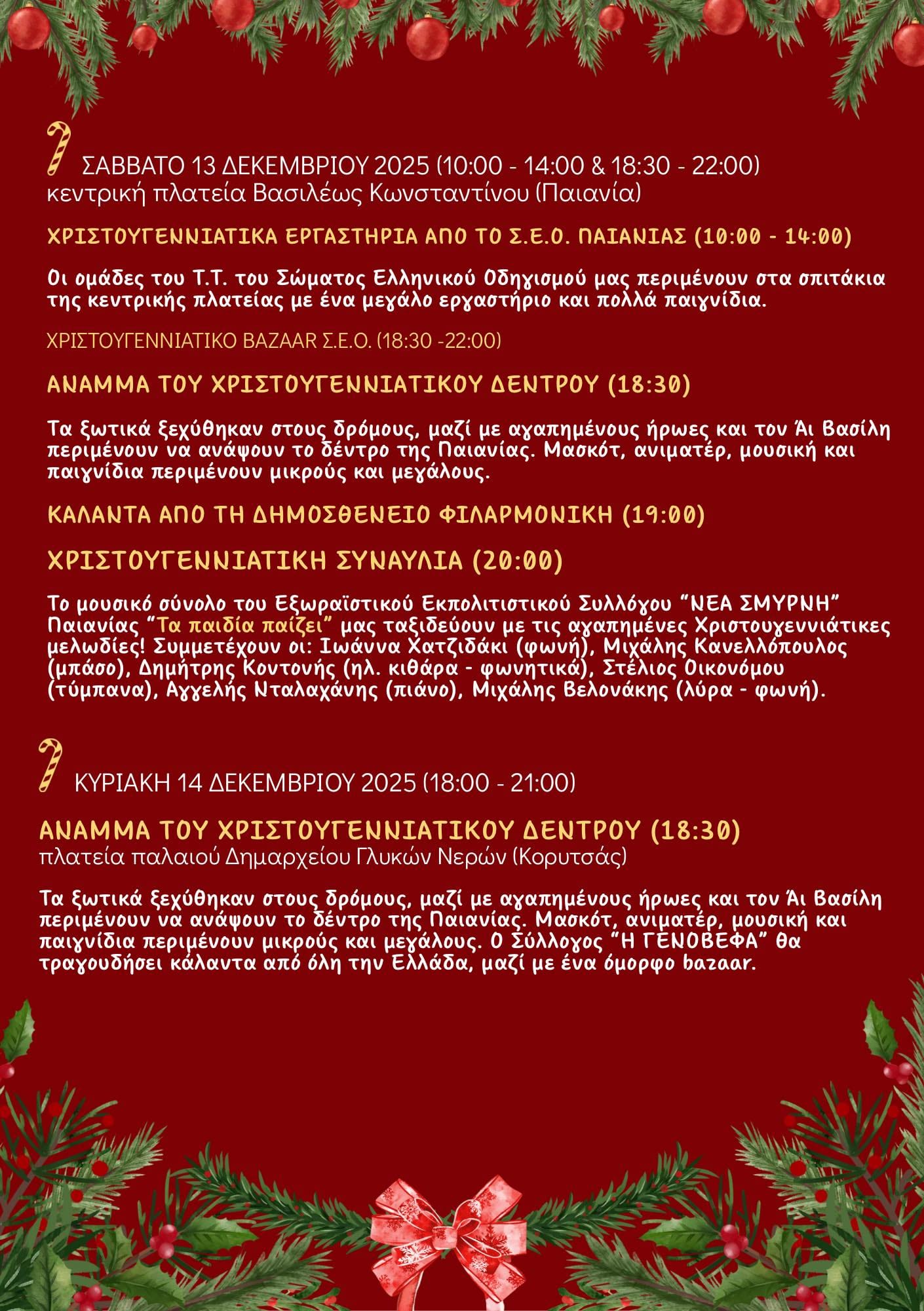 ✔︎Η αρχή γίνεται από την κεντρική πλατείας της Παιανίας (Βασιλέως Κωνσταντίνου) το Σαββάτο 13 Δεκεμβρίου οπότε στις 18.30 θα ανάψει το χριστουγεννιάτικο δέντρο παρουσία του Άι Βασίλη και των ξωτικών του ενώ μασκότ και ανιματέρ θα υποδεχθούν τους δημότες με μουσική και παιχνίδια. Τη σκυτάλη θα πάρει η Δημοσθένειος Φιλαρμονική για τα κάλαντα ενώ το μουσικό σύνολο του Εξωραϊστικού Εκπολιτιστικού Συλλόγου “Νέα Σμύρνη” Παιανίας, “Τα παιδία παίζει” θα απογειώσουν το εορταστικό κλίμα με χριστουγεννιάτικες μελωδίες.