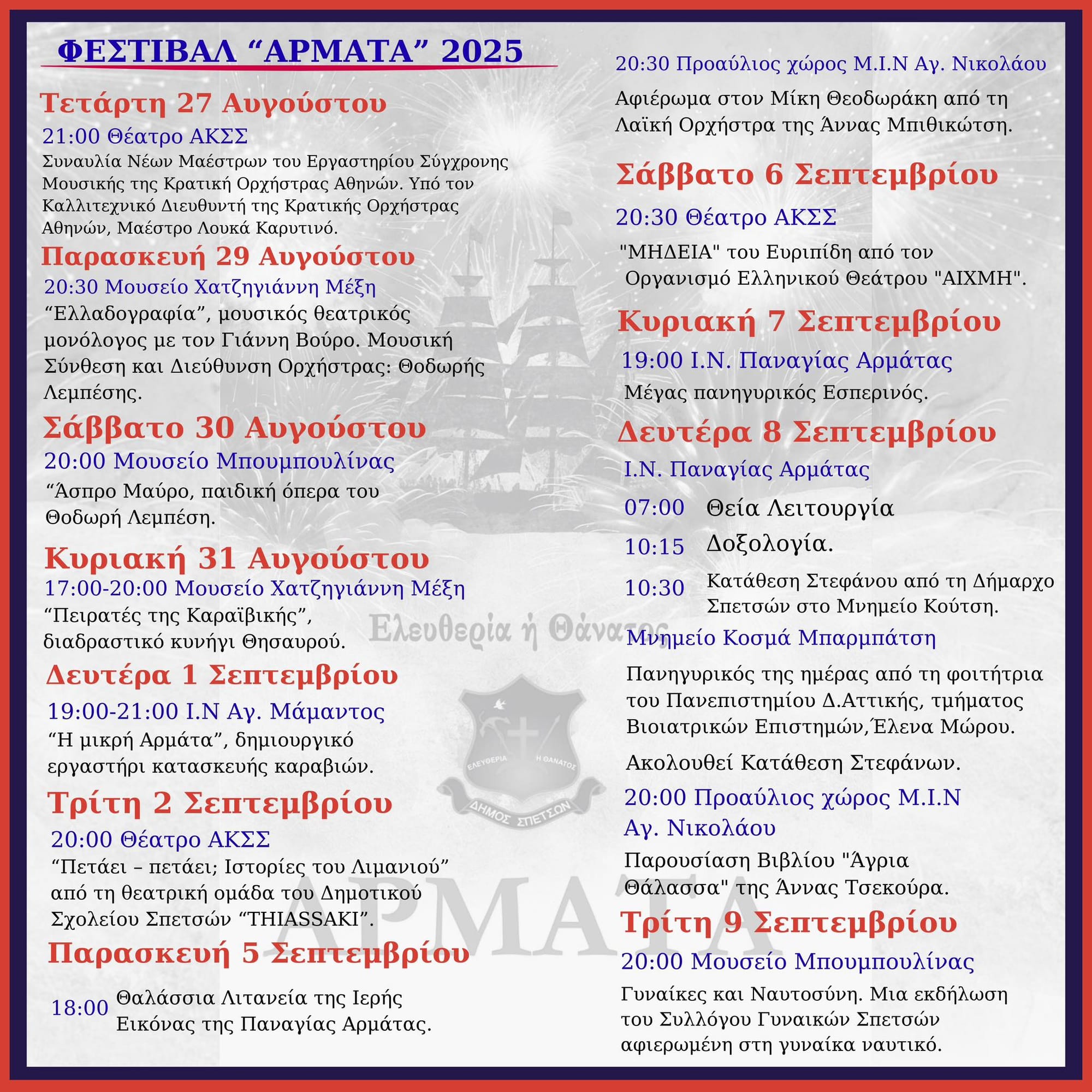 Η Αρμάτα, με ρίζες στην ένδοξη Ελληνική παράδοση, αναβιώνει τη ναυμαχία των Σπετσών του 1822, μέσα από μια τελετουργική αναπαράσταση, που στέκει κάθε χρόνο ως φόρος τιμής στους ήρωες του ’21.