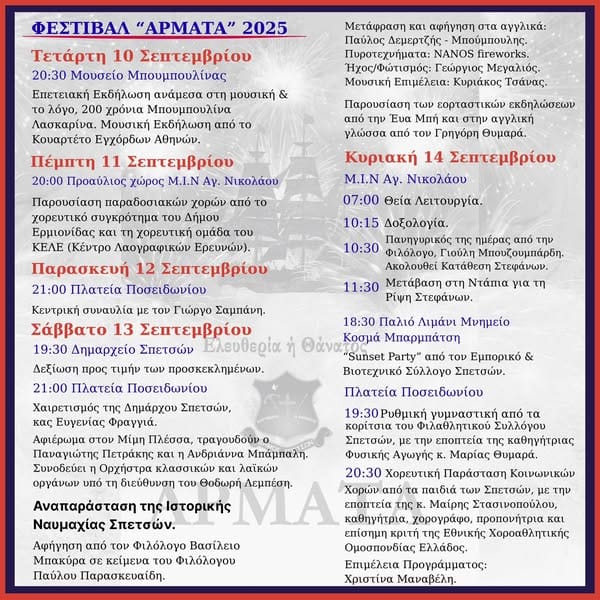 Οι Σπέτσες ετοιμάζονται να ζήσουν και φέτος ημέρες ιστορικής μνήμης, συγκίνησης και εθνικής περηφάνιας.